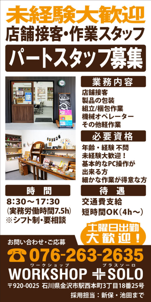 WORKSHOP +SOLOの店舗接客・作業スタッフを募集いたします。