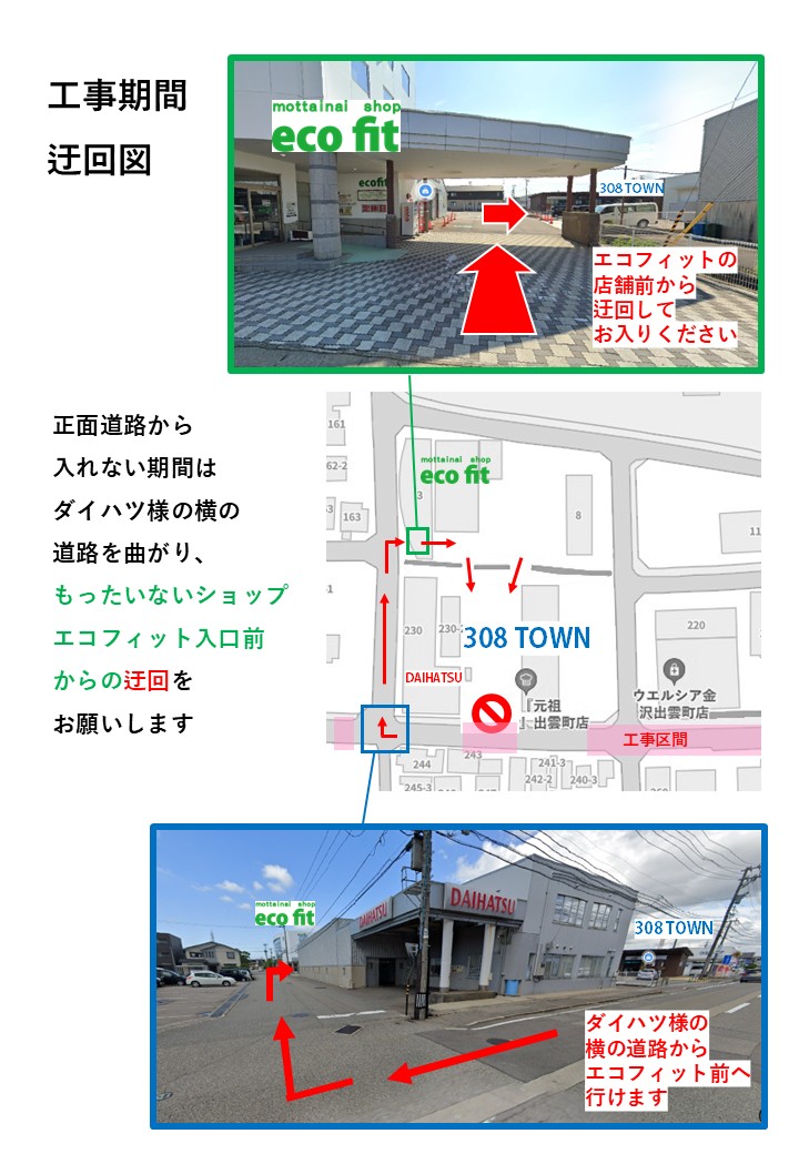 エコフィット店舗前の道路が、震災による破損の修復工事のため、一部通行止め/片道通行となります。